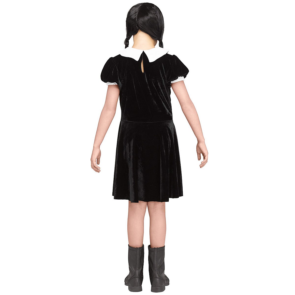Verwandle deine kleine Gothic-Prinzessin in die ikonische Wednesday Addams! Dieses elegante schwarze Kleid mit weißem Kragen fängt den düsteren Charme des Addams Family-Mädchens perfekt ein. Ideal für Halloween, Karneval oder Cosplay-Events.