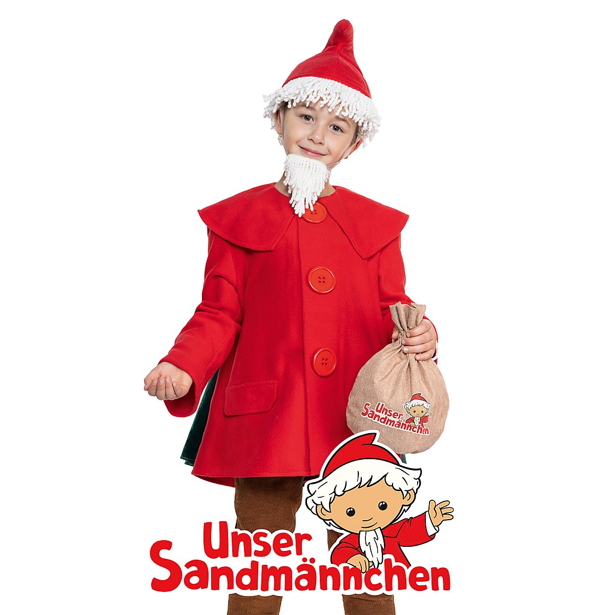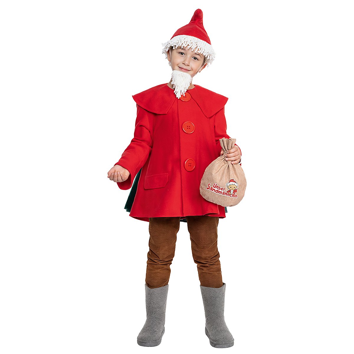 Unser Sandmännchen Kostüm für Kinder – entwickelt von MASKWORLD – besticht durch einen flauschigen, roten Mantel mit übergroßen Knöpfen (hinter denen sich allerdings Druckknöpfe verbergen) und authentischen Taschenklappen. Hinten an den Mantel ist ein samtglänzendes Cape in Tannengrün angenäht, das dem Originaldetail in nichts nachsteht. Eine rote Zipfelmütze ist selbstverständlich dabei; bei dieser sind an den unteren Rand dicke weiße Stoffkordeln genäht, die stilecht die Haare des Sandmanns darstellen. Im gleichen Stil ist der Spitzbart gestaltet, den Du ganz einfach mit zwei elastischen Bünden mit Klettverschluss an Deinen Ohren befestigen kannst. Zu guter Letzt beinhaltet das Kinderkostüm einen beigebraunen Beutel mit einer praktischen Handschlaufe und dem aufgedruckten Logo "Unser Sandmännchen". Mit diesem sympathischen Auftritt feierst Du nicht nur Deinen Held aus dem Vorabendprogramm, sondern weckst auch nostalgische Gefühle bei den Erwachsenen!